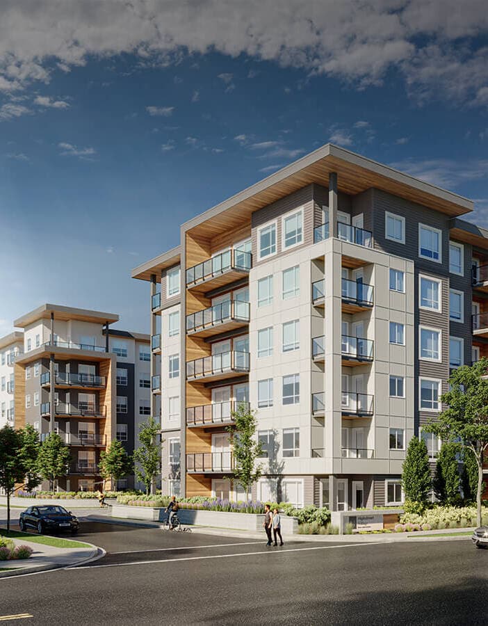 The latest phase offers exclusive resident amenities for extended indoor / outdoor living experience. The Nest—ground-level amenity space with an open lawn area, outdoor kitchen with BBQ and harvest table seating, children’s play area, and an indoor fitness area with exercise equipment. The Lookout—rooftop with community garden beds and picnic benches, looking out on the sweeping Fraser Valley views including Mt Baker.